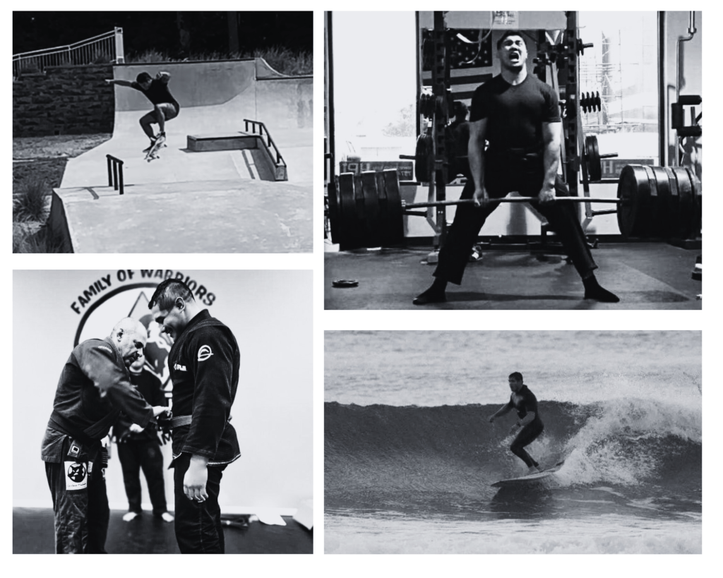 Over the years, I have trained in wrestling, jiu jitsu, muay thai, and powerlifting. More recently I have centered my focus around improving performance and resilience in surfing and skateboarding (lot’s of mobility, alternative strength training methods, and aerobic development).
